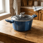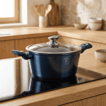 Lonec s pokrovom je izdelan iz kovanega aluminija z 3-slojno marmorno prevleko proti prijemanju. Ergonomski ročaji in pokrov z nerjavečim obročem omogočajo udobno in varno uporabo. Primerno za vse kuhalne površine.