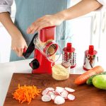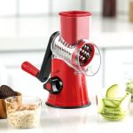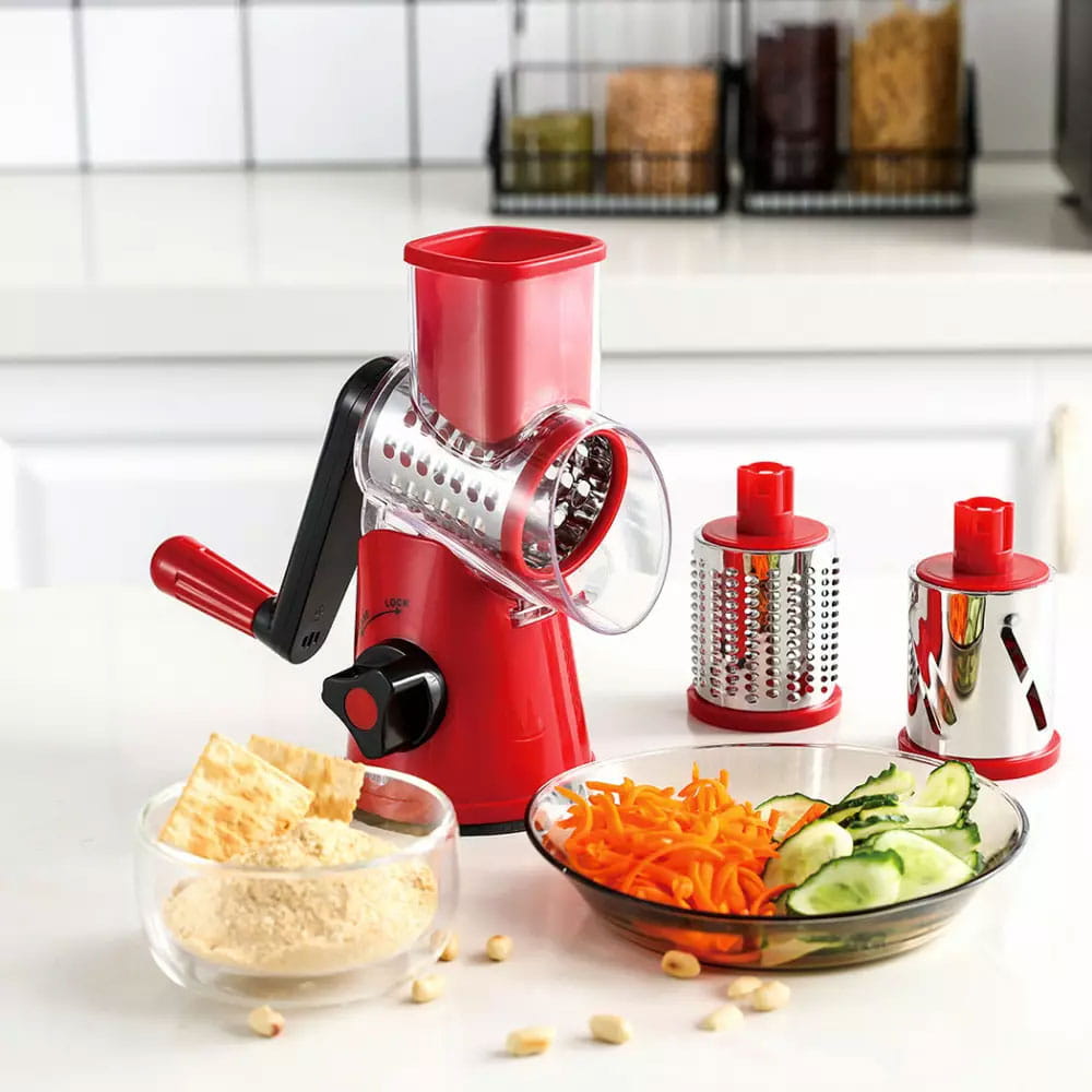 Multifunkcijski rezalnik Kinghoff v rdeči barvi omogoča hitro ribanje in rezanje zelenjave. Ima tri zamenljiva rezila za fino, grobo in standardno mletje, nagnjen boben za enostaven izhod zelenjave ter močno prisesno podlago za stabilnost. Velikost rezalnika je 26,5 × 12,5 × 24 cm, primeren pa je tudi za pomivalni stroj.