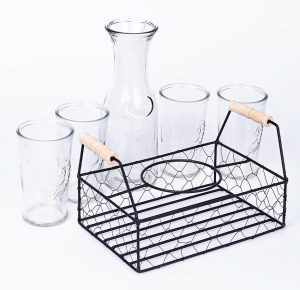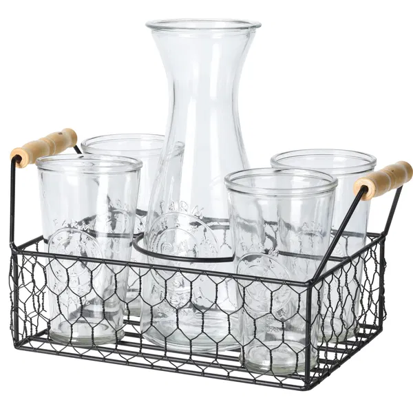 Komplet vsebuje 4 kozarce (450 ml), karafo 1 L in pladenj s košaro, ki služi tudi kot priročno stojalo. Slogovno dekorirani kozarci in steklenica bodo popestrili vsako mizo, hkrati pa so praktični za poletne zabave, vrtne dogodke ali družinska praznovanja.