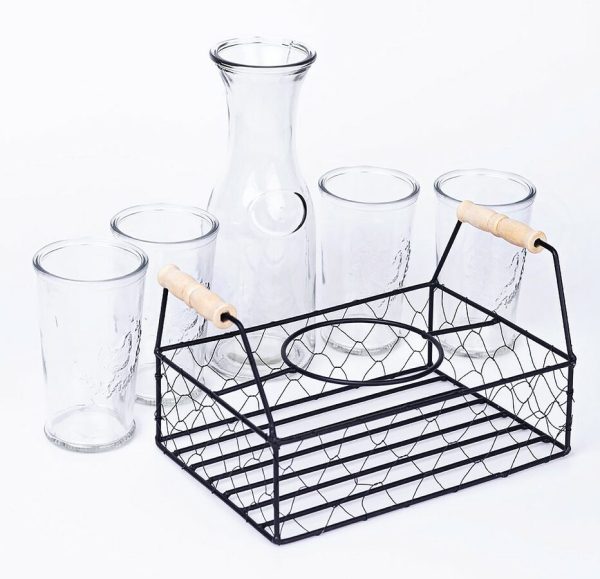 Set 4 kozarcev 450 ml, 1 L steklenice in pladnja je eleganten in praktičen komplet za raznovrstne napitke. Vključen pladenj s košaro omogoča enostavno prenašanje karafe in kozarcev.