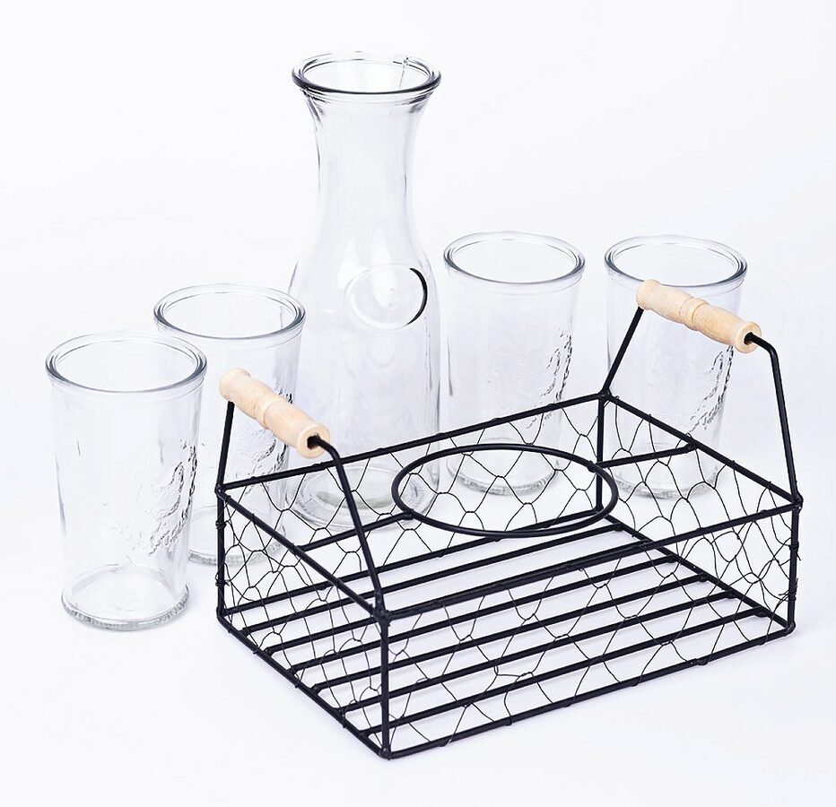 1× karafa 1l, 4× kozarci 450ml, 1× pladenj s košaro