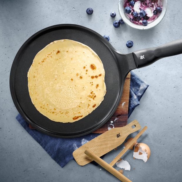 Ponev WMF Devil Crêpes je namensko zasnovana za pripravo popolnih palačink. Dolgotrajna 3-slojna prevleka PermaDur brez PFOA in debela konstrukcija iz litega aluminija zagotavljata enakomerno kuhanje. Rezultat so hrustljave, zlate in vsakič okusne puhaste palačinke.
